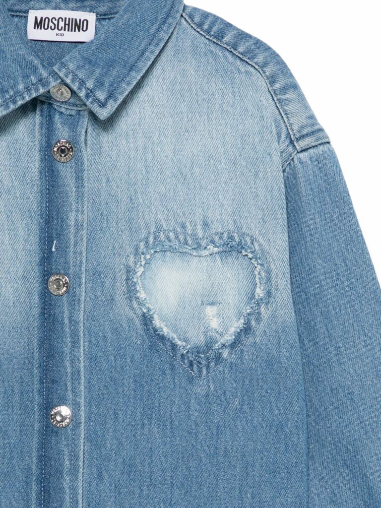 Chiusura con bottoni blu sul petto, dettaglio a cuore, maniche lunghe, polsini con bottoni.