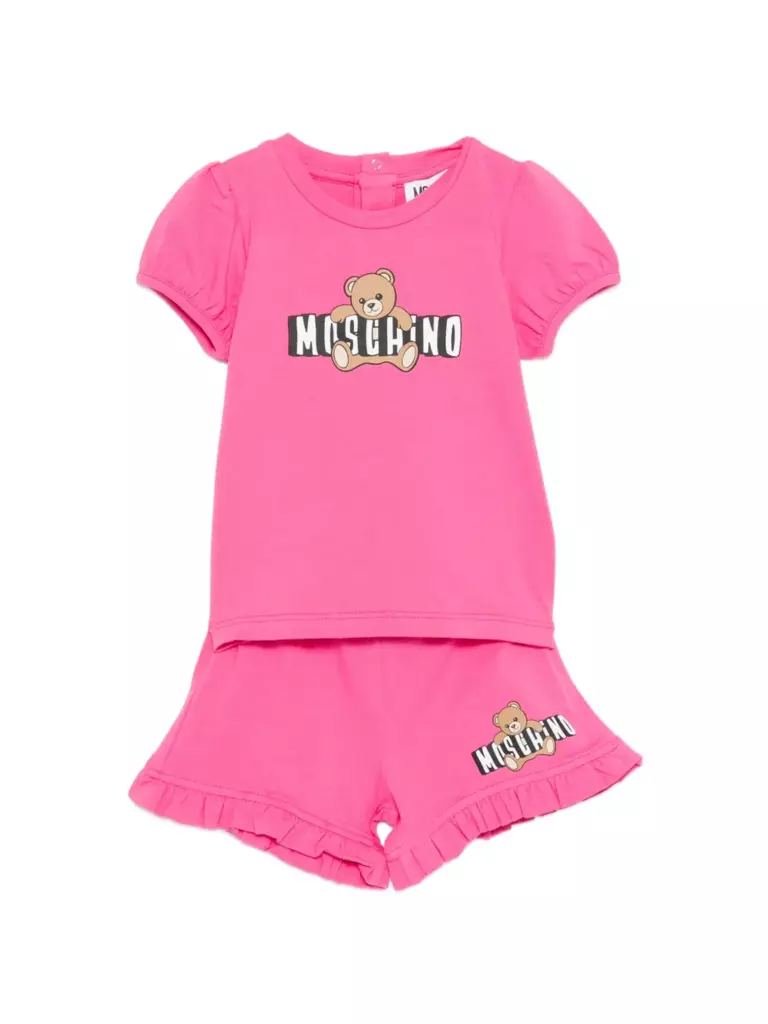 stampa orsetto rosa, volant, maniche corte, scollo rotondo, chiusura con bottoni