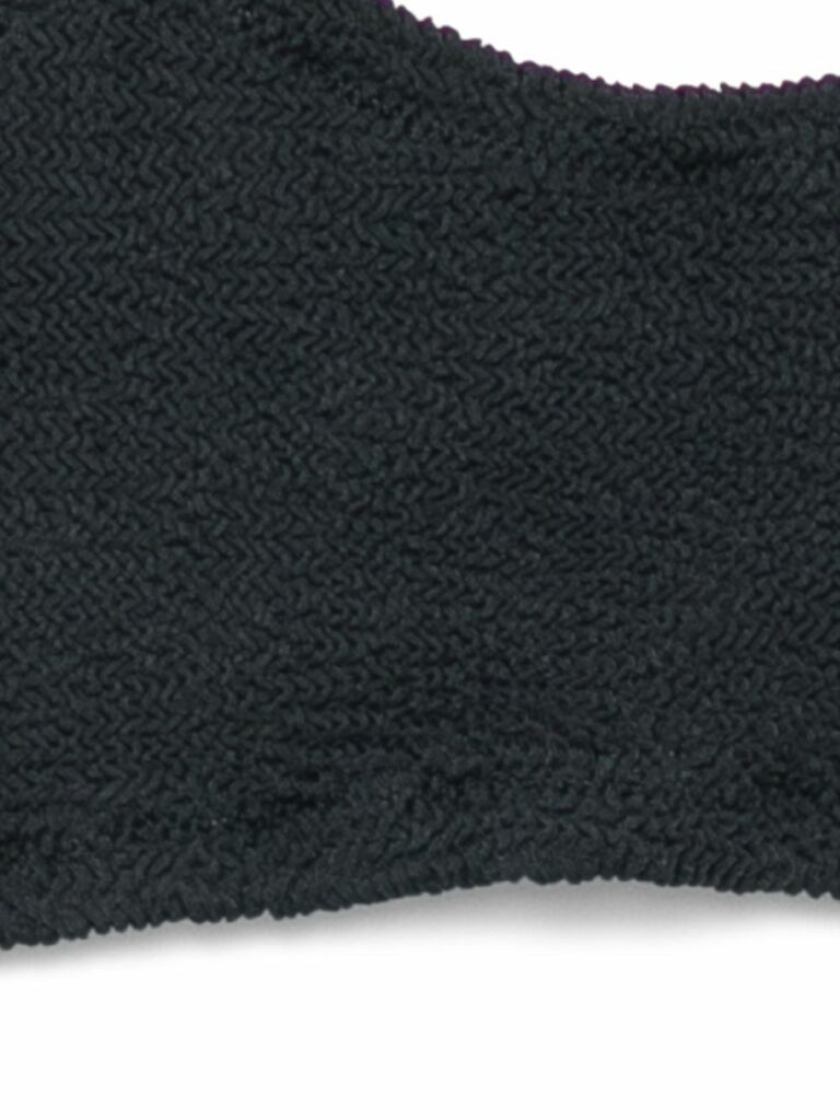 Tessuto grigio scuro increspato, scollo rotondo, elastico in vita. Ricorda di provare il costume da bagno sopra i tuoi indumenti.