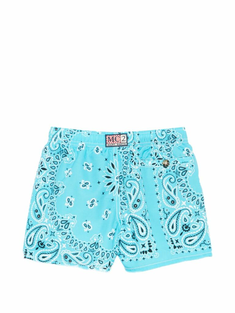 stampa paisley turchese, elastico in vita con coulisse, tasche laterali a fessura, patch logo sulla tasca posteriore