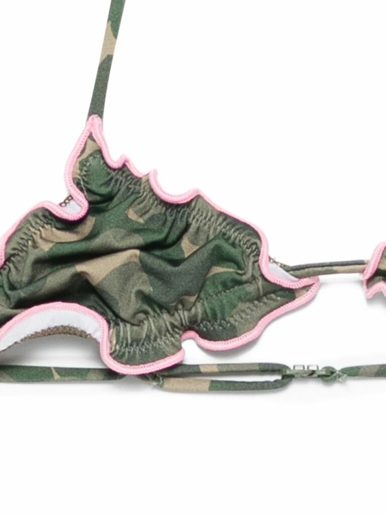 Costume da bagno con stampa mimetica verde, volant, scollo all'americana, chiusura posteriore con gancio, elastico in vita. Ricorda di provare il costume sopra i tuoi indumenti.