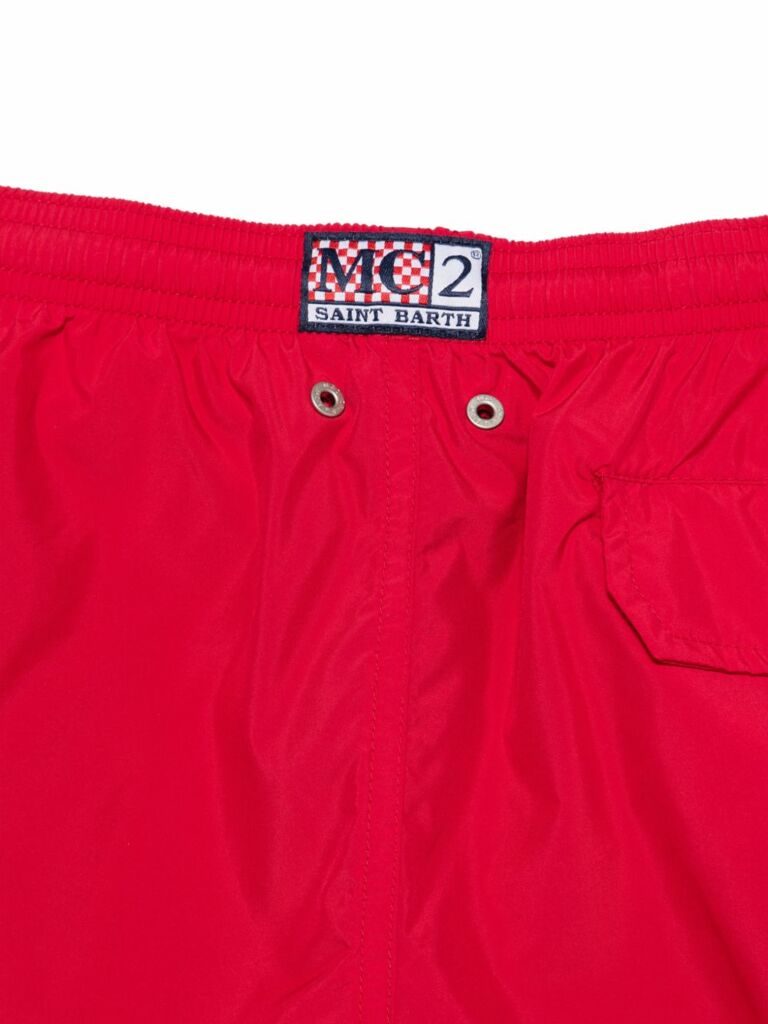 Coulisse elastica rossa in vita, patch con logo sul davanti, patch con logo sul retro, due tasche laterali a fessura, tasca posteriore con patta. Ricorda di provare il costume da bagno sopra i tuoi indumenti.