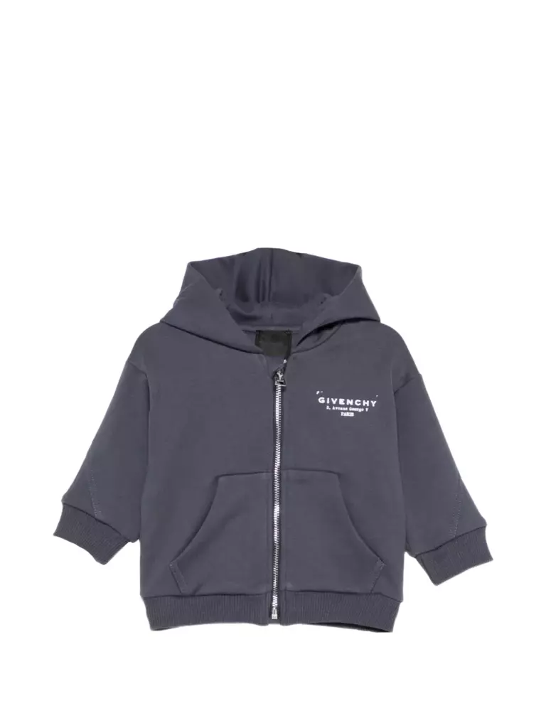 chiusura con zip frontale blu, cappuccio, tasche anteriori a marsupio, stampa del logo