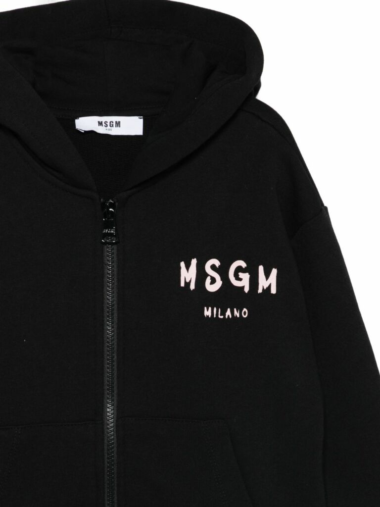 dettaglio logo nero chiusura frontale con zip maniche lunghe tasca a marsupio frontale cappuccio