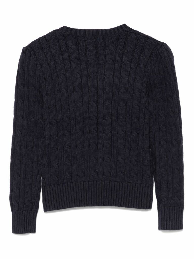 chiusura con bottoni blu navy sulla spalla, scollo rotondo, maniche lunghe