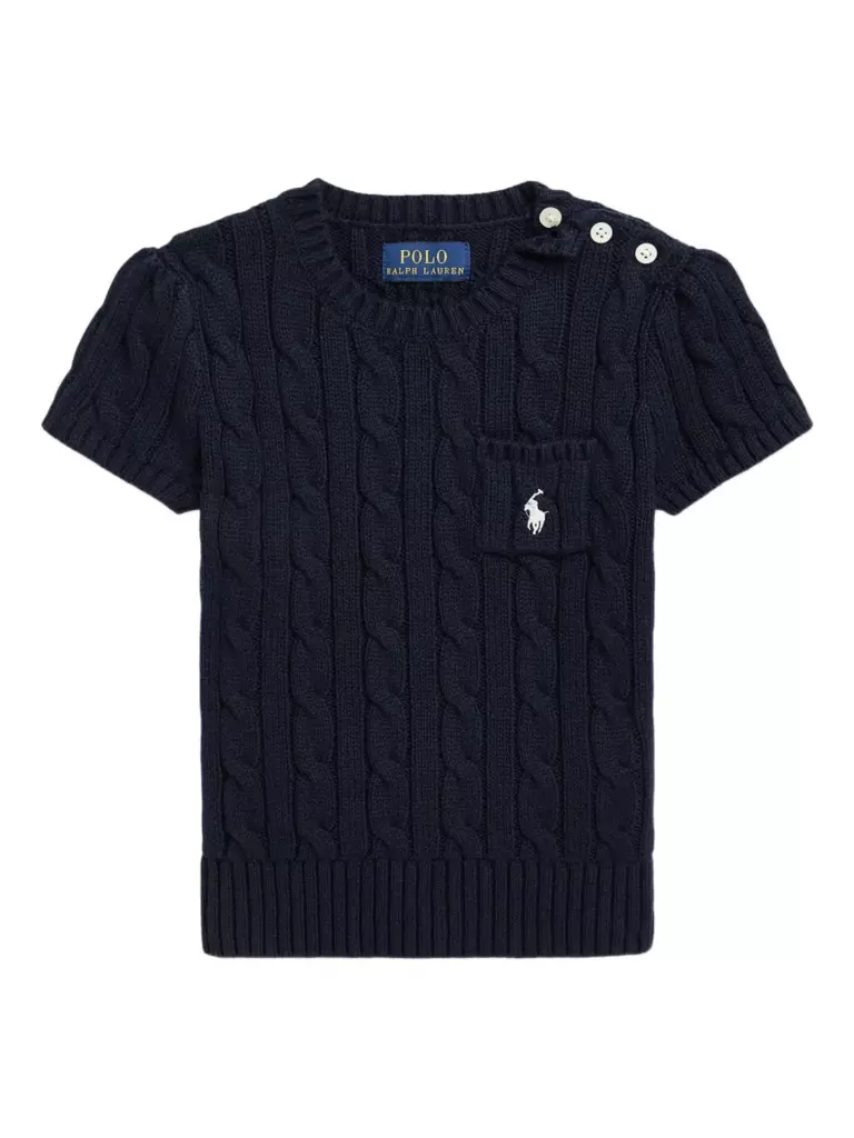 tasca applicata sul petto in maglia a trecce blu navy, logo ricamato, scollo rotondo, chiusura con bottoni sulle spalle