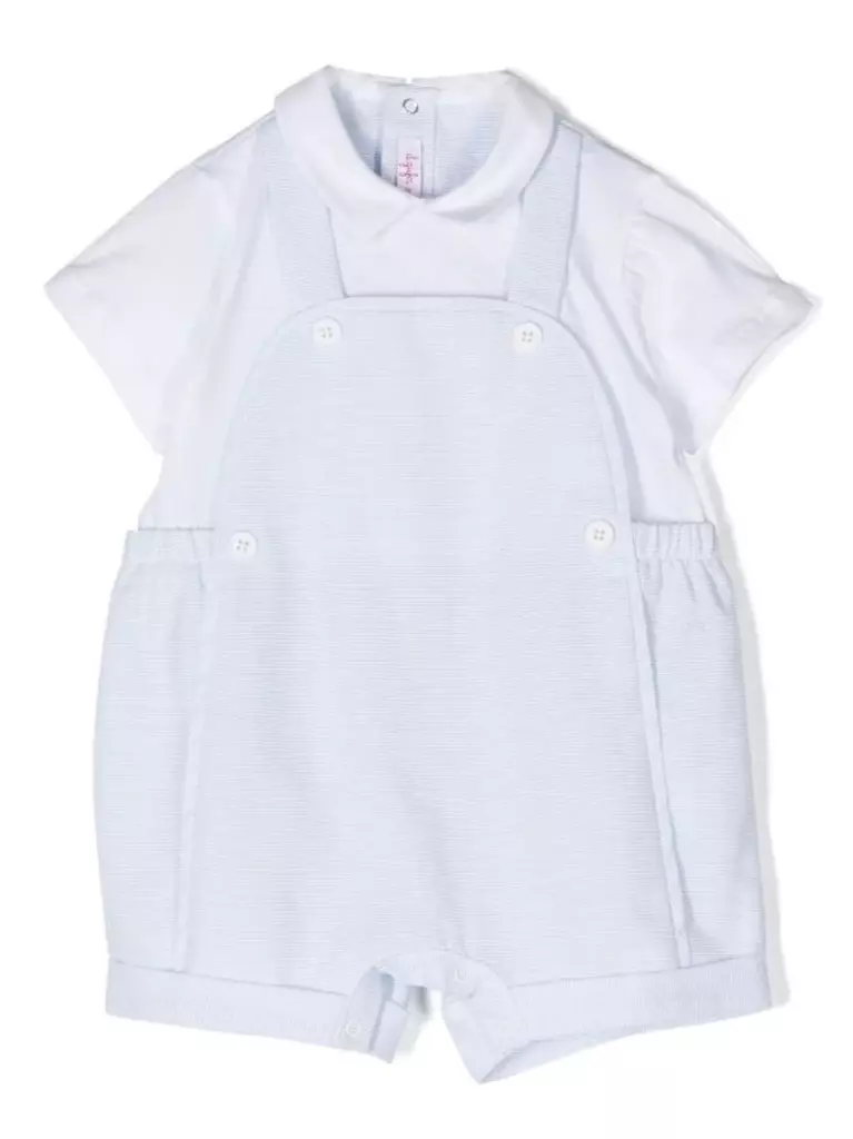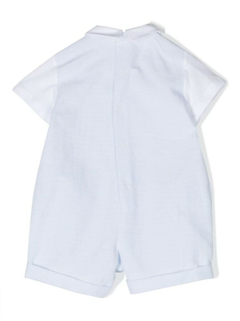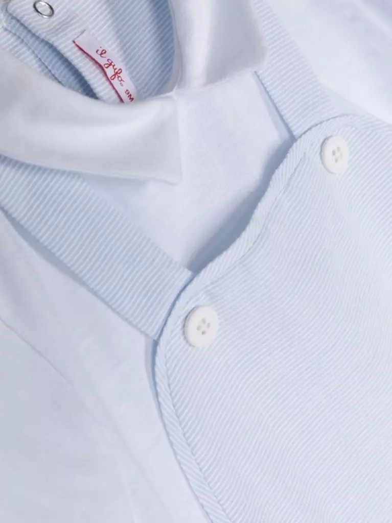 Shorties a righe con effetto a strati de IL GUFO. Modello con design a strati bianco, azzurro, motivo a strisce orizzontali, colletto piatto a punta, chiusura con bottoni sul retro, chiusura frontale con bottoni, maniche corte, risvolto e lunghezza alla co