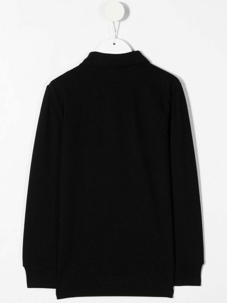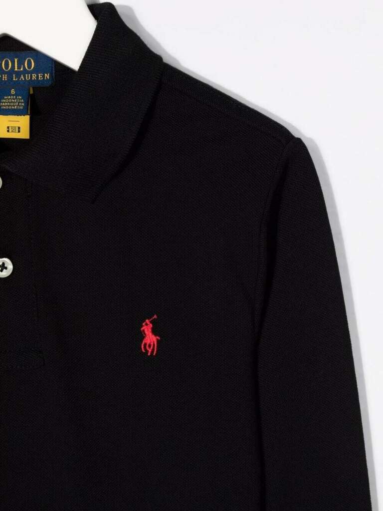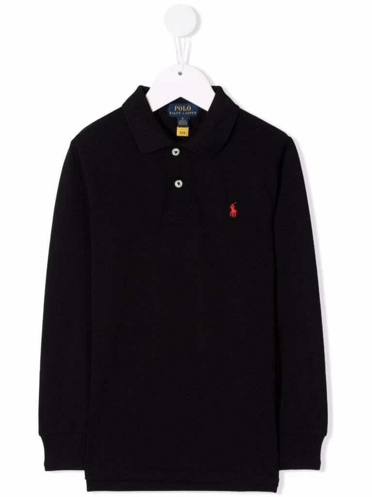 Polo nera in cotone con logo ricamato di RALPH LAUREN KIDS caratterizzata da logo ricamato sul petto, colletto a polo, chiusura frontale con bottoni, maniche lunghe e orlo dritto.