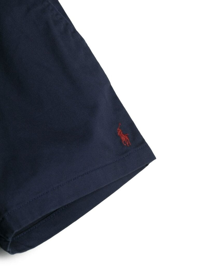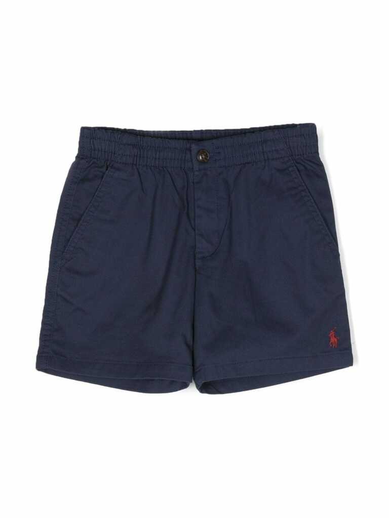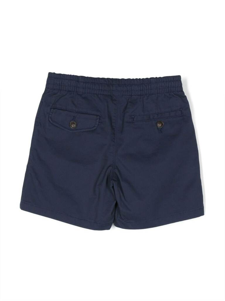 Pantaloni chino Polo Pony di RALPH LAUREN KIDS in cotone elasticizzato blu navy, caratteristico motivo Polo Pony, elastico in vita, chiusura frontale con bottone e zip, due tasche laterali a fessura, due tasche posteriori a filetto e lunghezza fino alla coscia.
