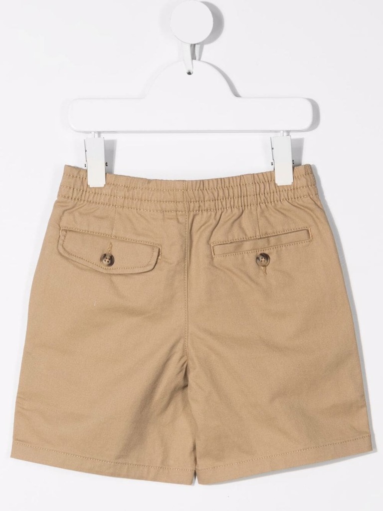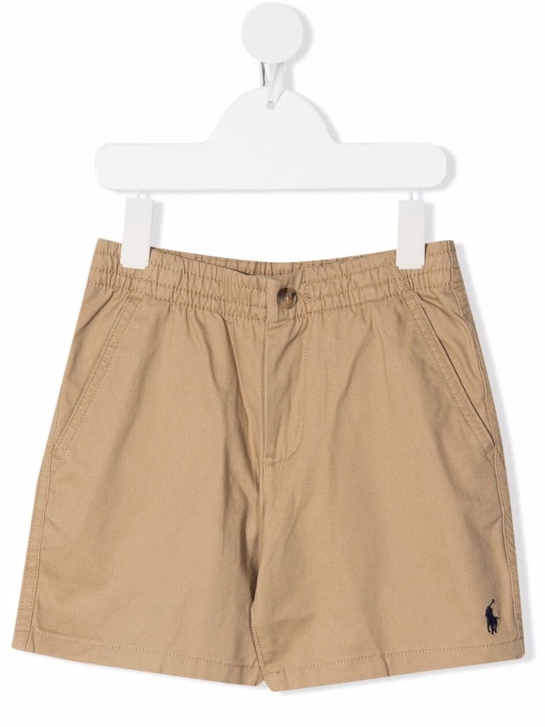 Pantaloncini cargo elasticizzati in misto cotone color kaki di RALPH LAUREN KIDS con caratteristico motivo Polo Pony, elastico in vita, chiusura frontale con bottoni e tasche a filetto sui lati.