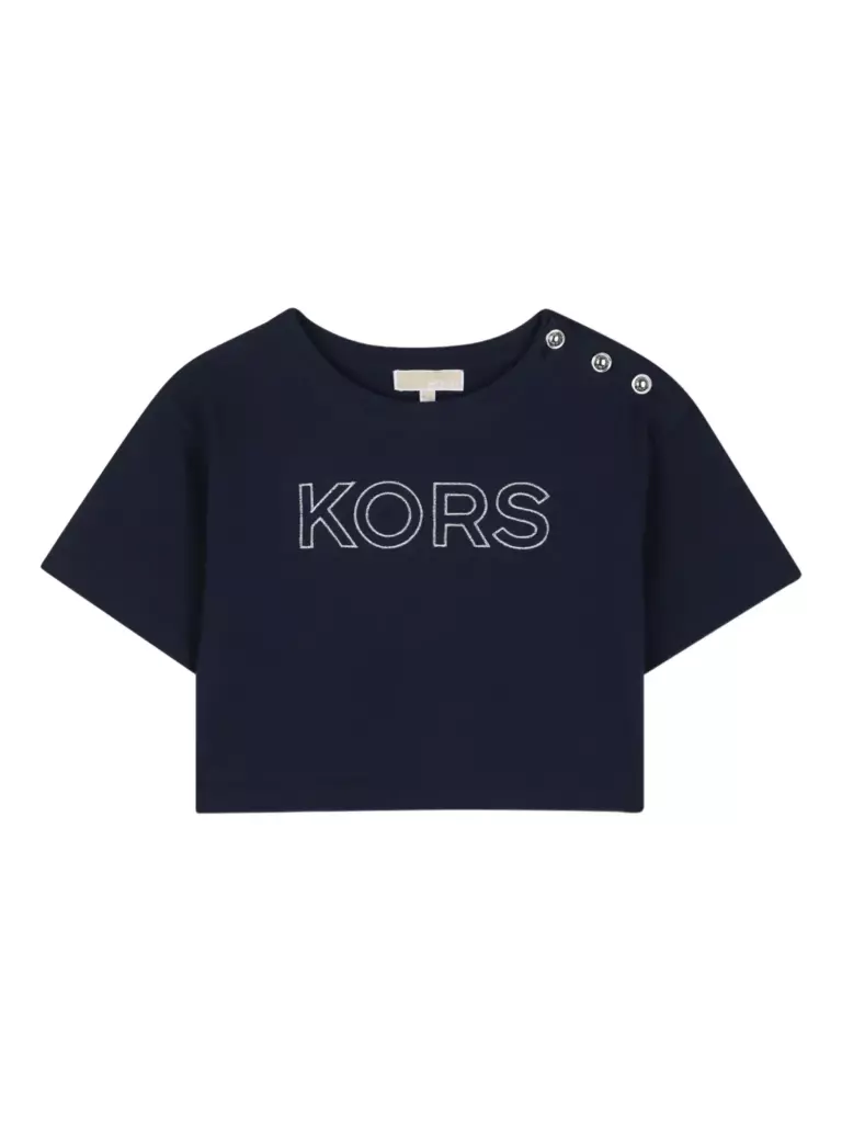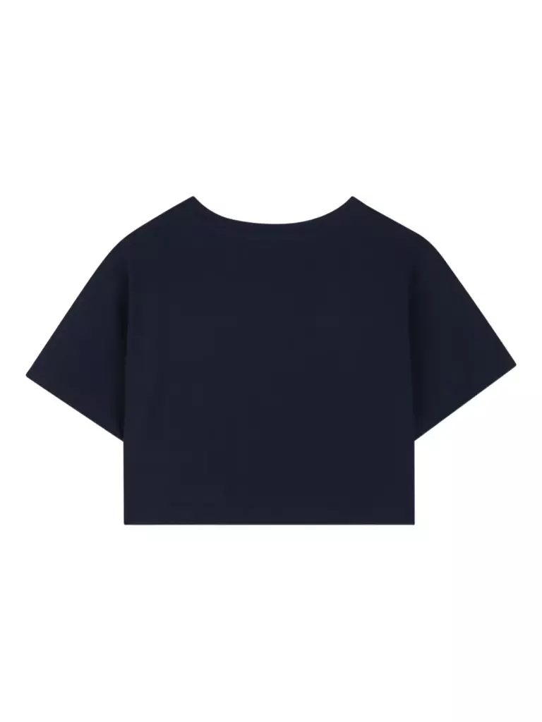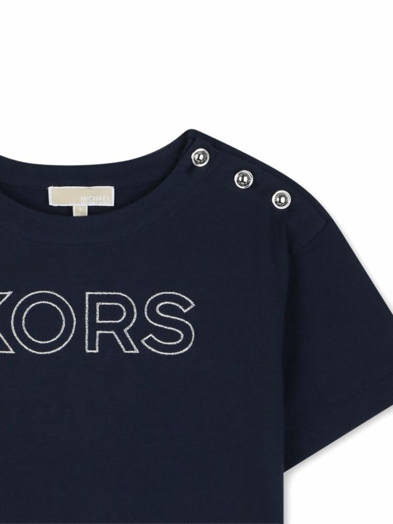 dettaglio logo blu scuro, spalle abbottonate, scollo tondo, maniche corte