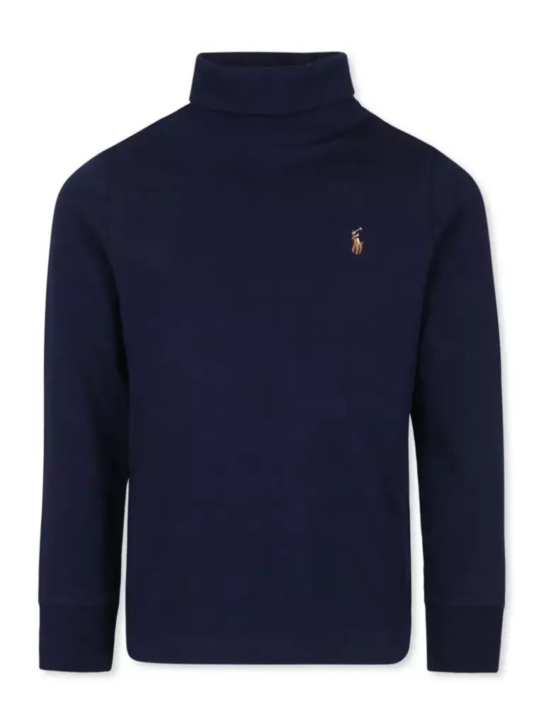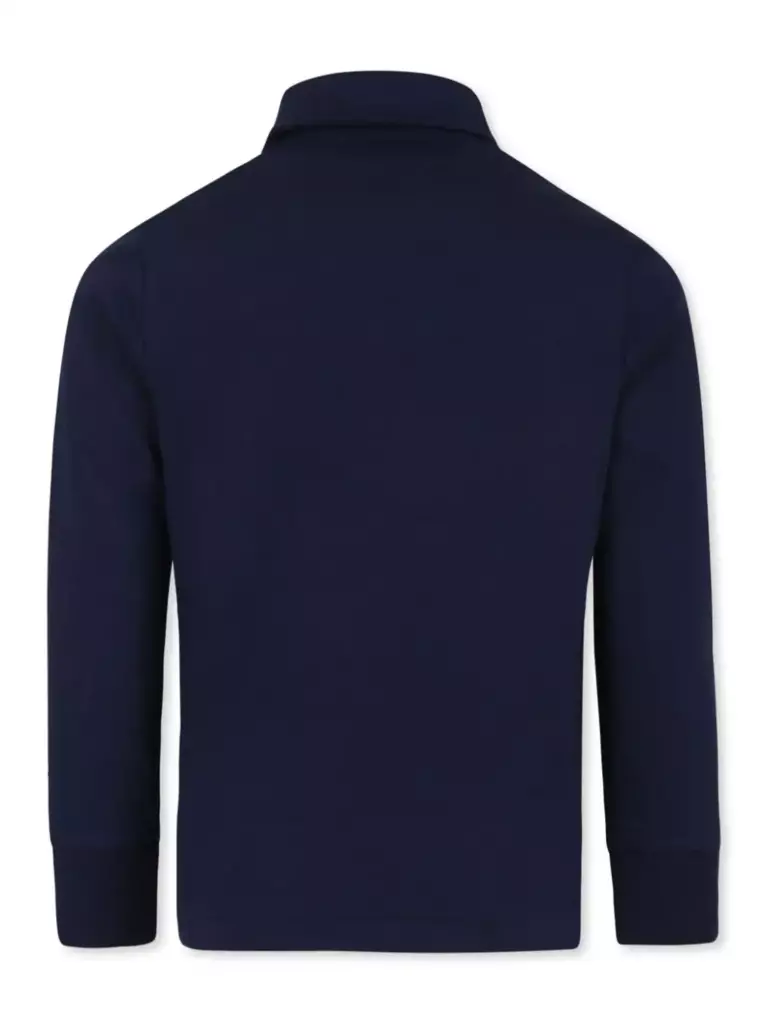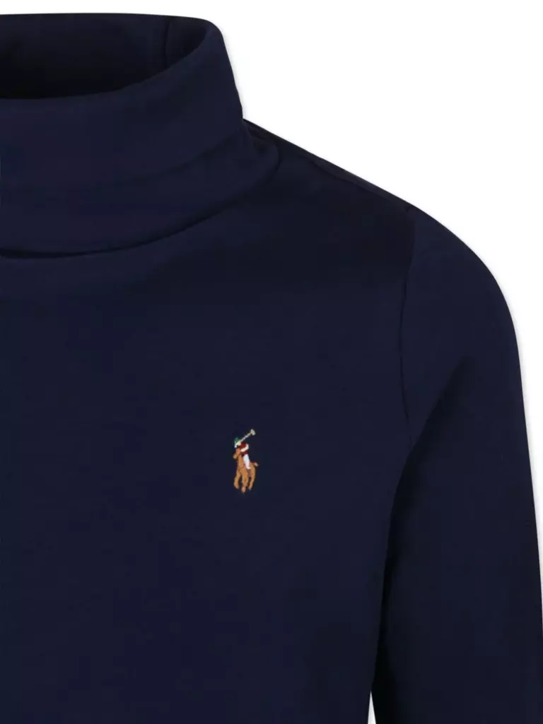 collo alto in cotone blu maniche lunghe logo ricamato sul davanti polsini e orlo a coste