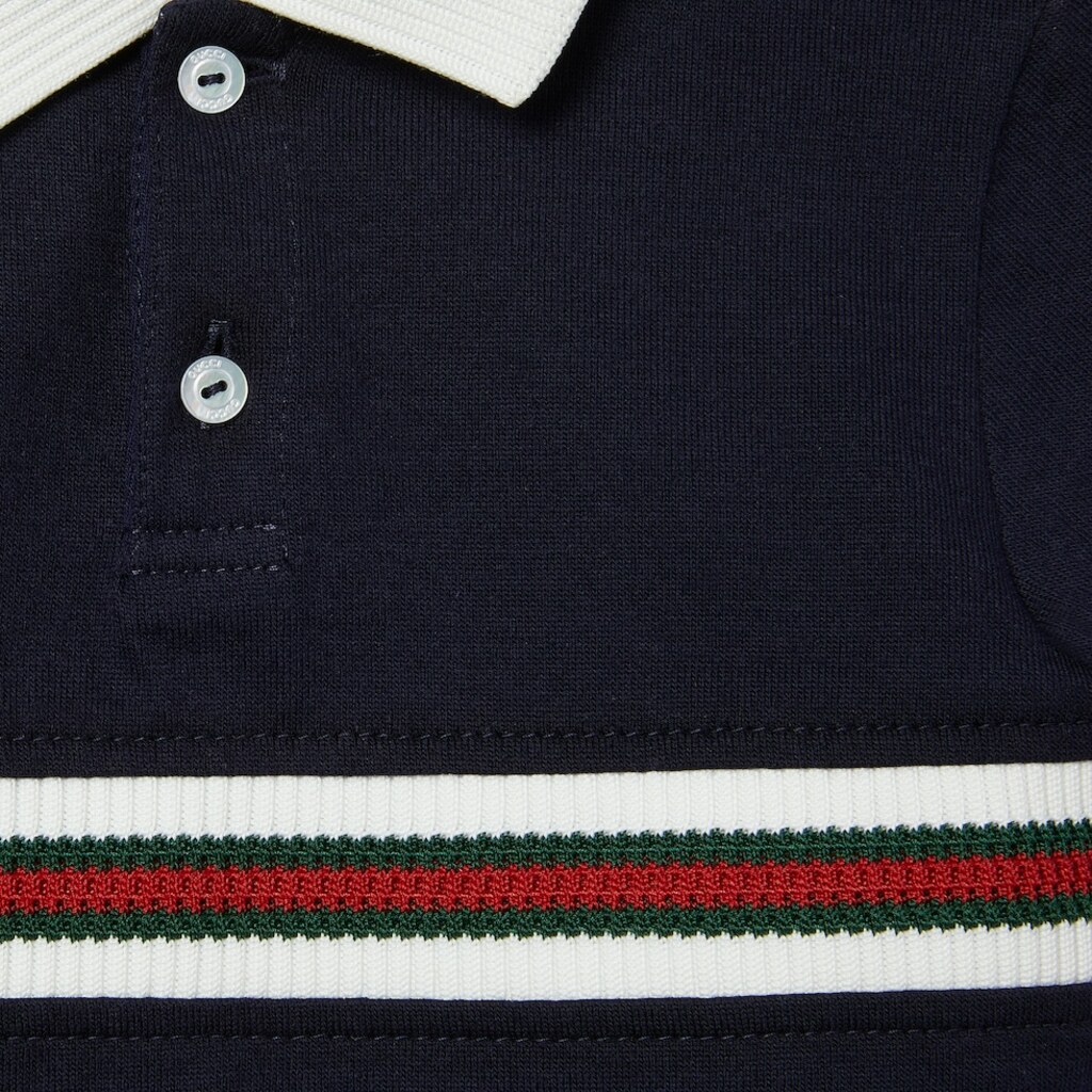 colletto polo con dettagli a righe blu navy, maniche corte, chiusura con bottoni automatici, dettagli a coste