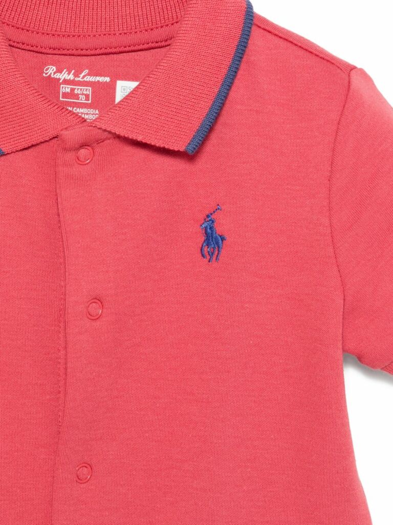 colletto polo rosso, maniche corte, chiusura frontale con bottoni, dettagli ricamati, profili a contrasto