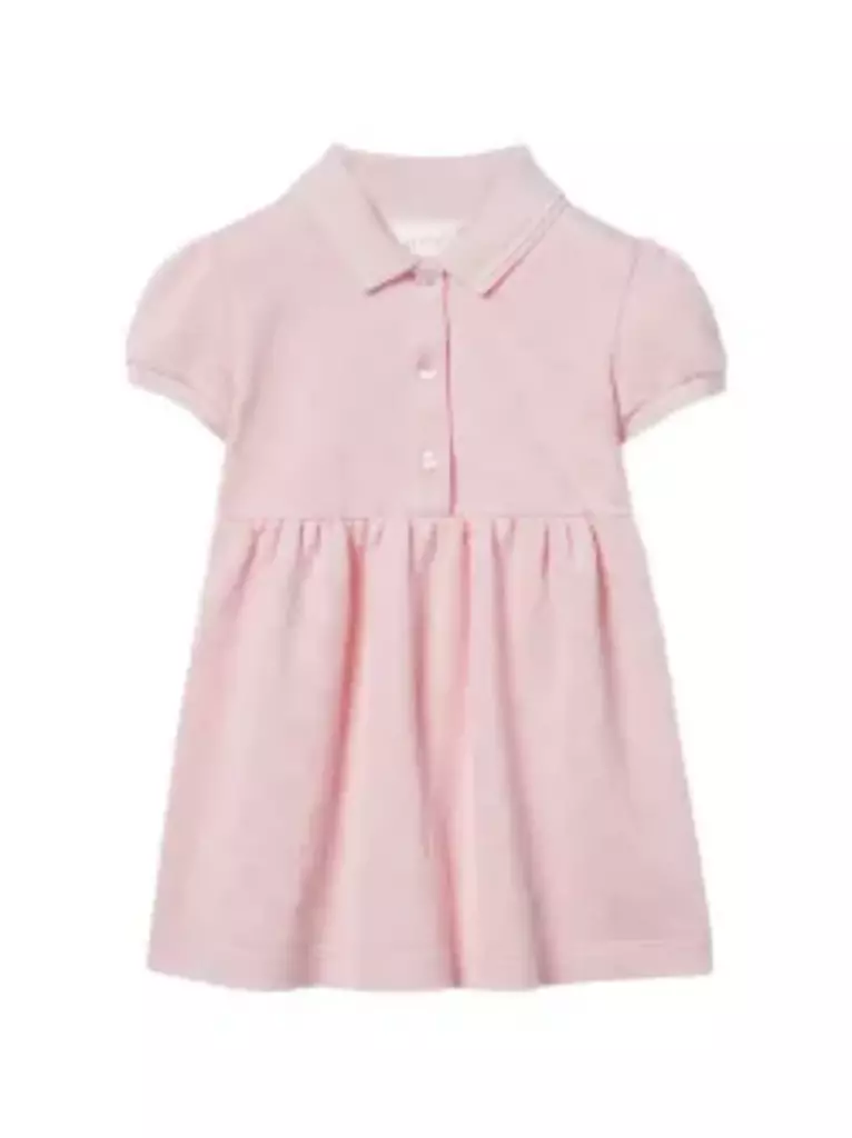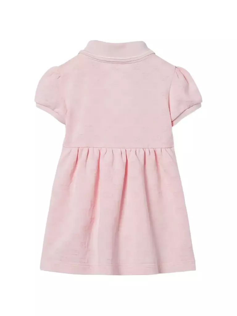 Gonna a trapezio con colletto, maniche a sbuffo, chiusura con bottoni rosa e motivo con logo