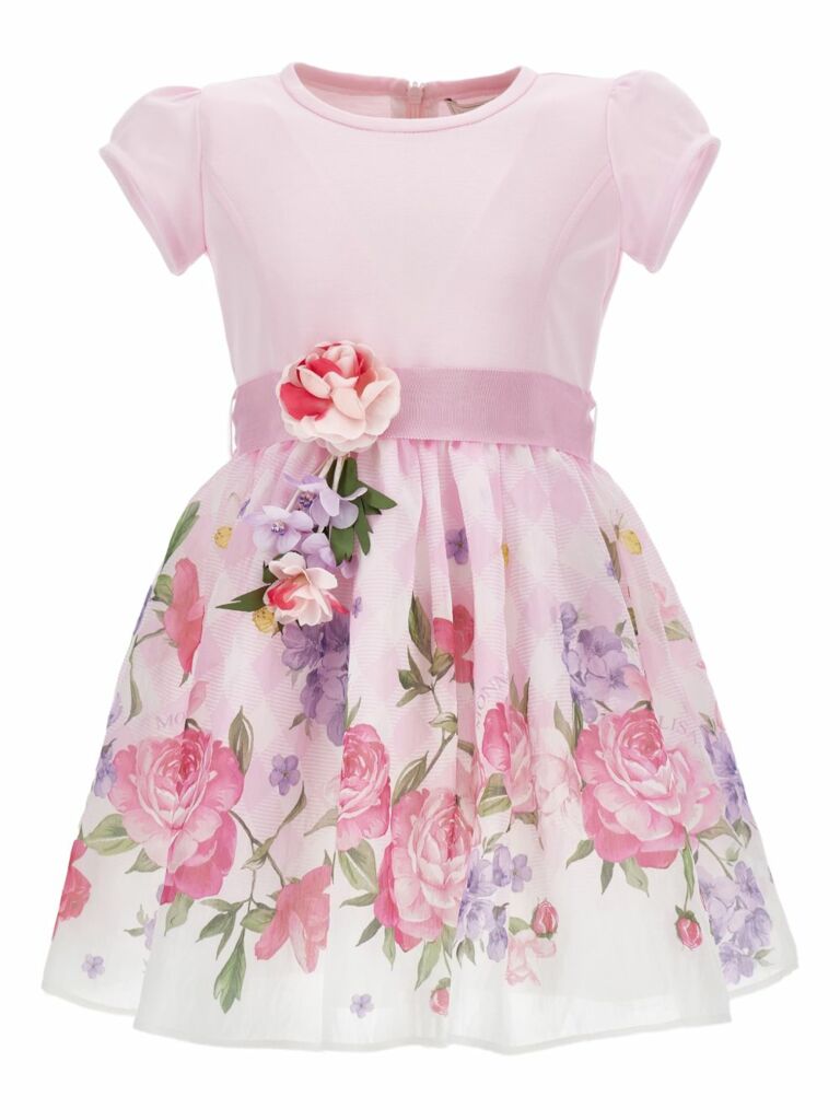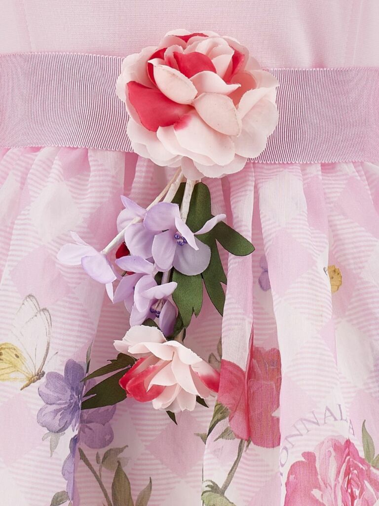 stampa floreale rosa dettaglio applicazione scollo rotondo maniche corte dettaglio nastro