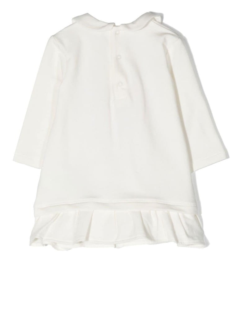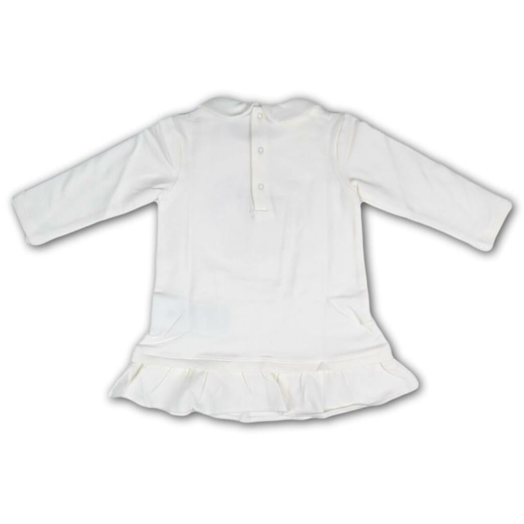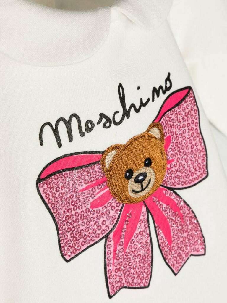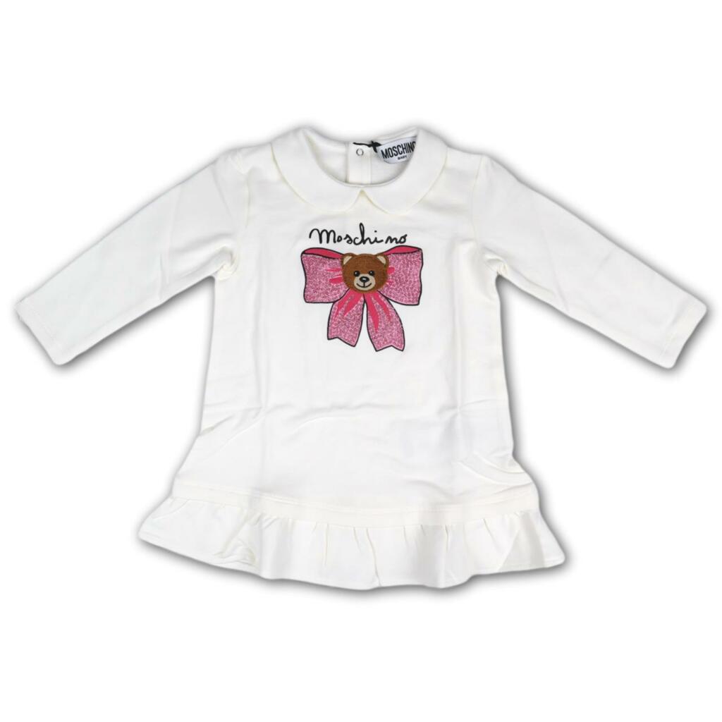 vestito con orsetto decorato di MOSCHINO KIDS caratterizzato da orlo a balze, decorazioni con cristalli, chiusura con bottoni a pressione sul retro, colletto arrotondato, maniche lunghe, bianco nuvola, cotone, dettaglio con fiocco e stampa di orsetto giocattolo.
